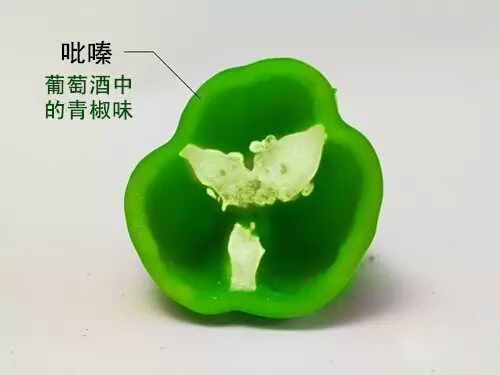 在葡萄酒中,“青椒”一词通常被用来描述酒中刺鼻的香气,它可以是一个正面的品酒词。产自加州(California)的赤霞珠(Cabernet Sauvignon)葡萄酒通常带有青椒的风味,恰好可以与酒中的黑果风味如黑醋栗相平衡。
