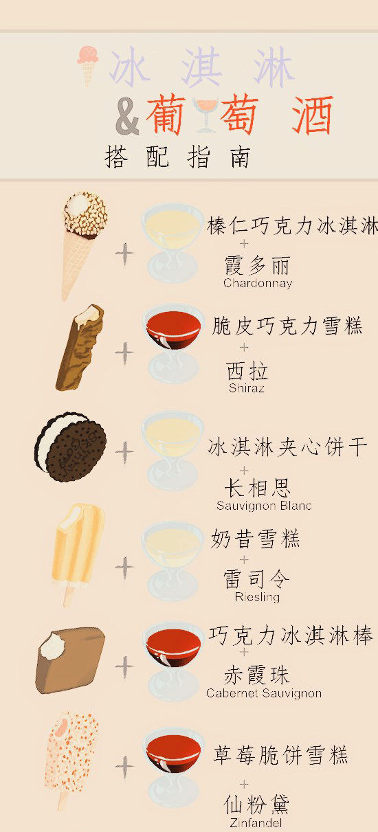 学会了上图中葡萄酒和冰淇淋的搭配方法,不如就在这个夏天试一试吧:买一根喜欢的冰淇淋,开一瓶可以与之搭配的美酒,为自己在炎热的夏日中争一方冰凉天地。