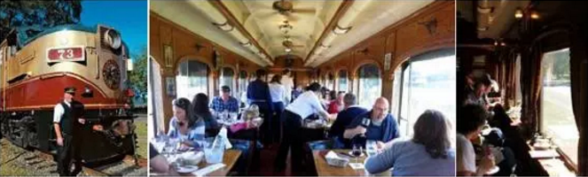 纳帕溪谷用一列古董火车装修成“品酒列车”,每天行驶在山谷中,专门为游客提供服务,是专门为游客打造的一种新型品酒体验方式。列车有两个老式柴油火车头,三节车上厨房,还有红酒列车一些已经退役的上世纪的老车厢。