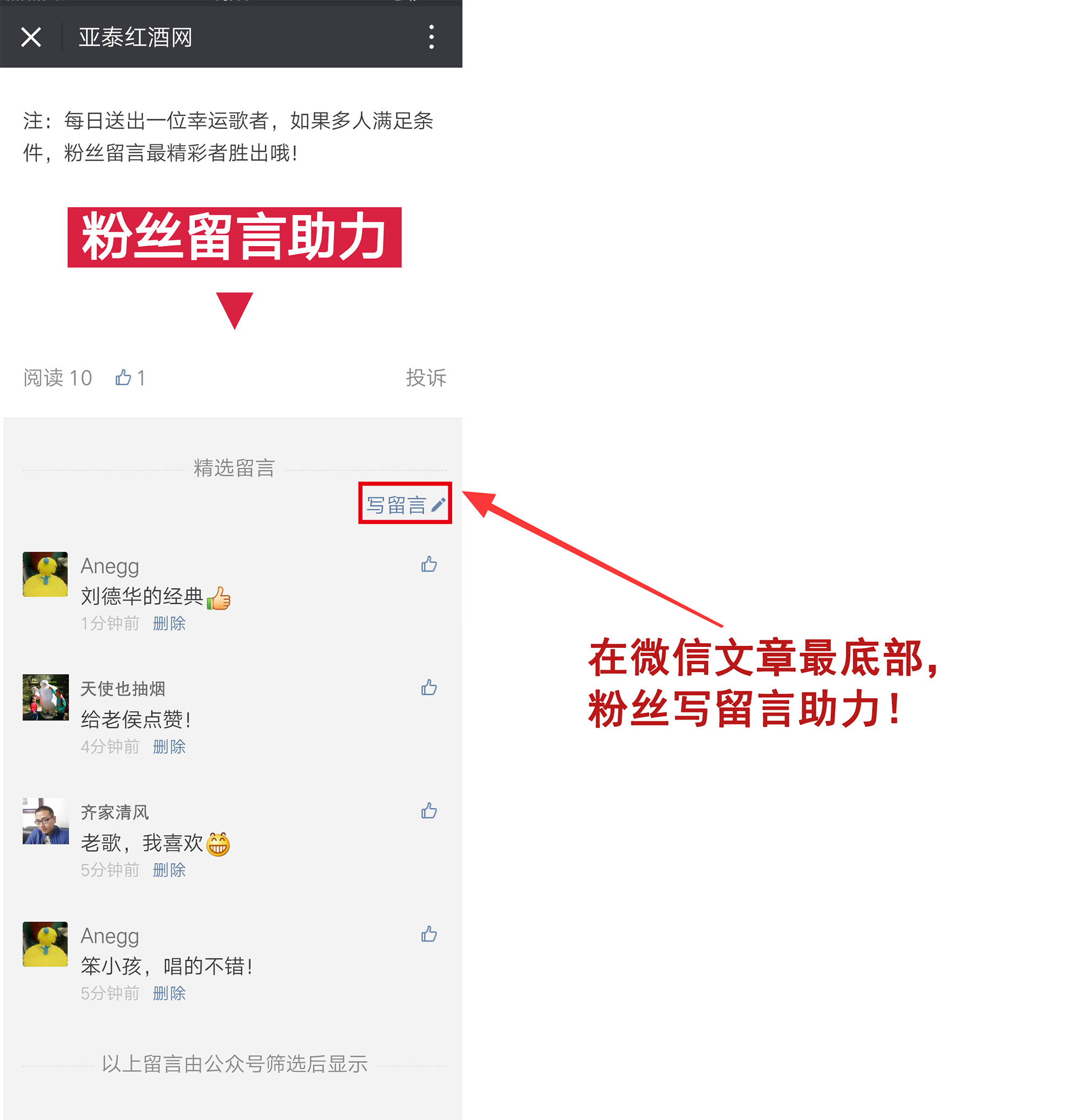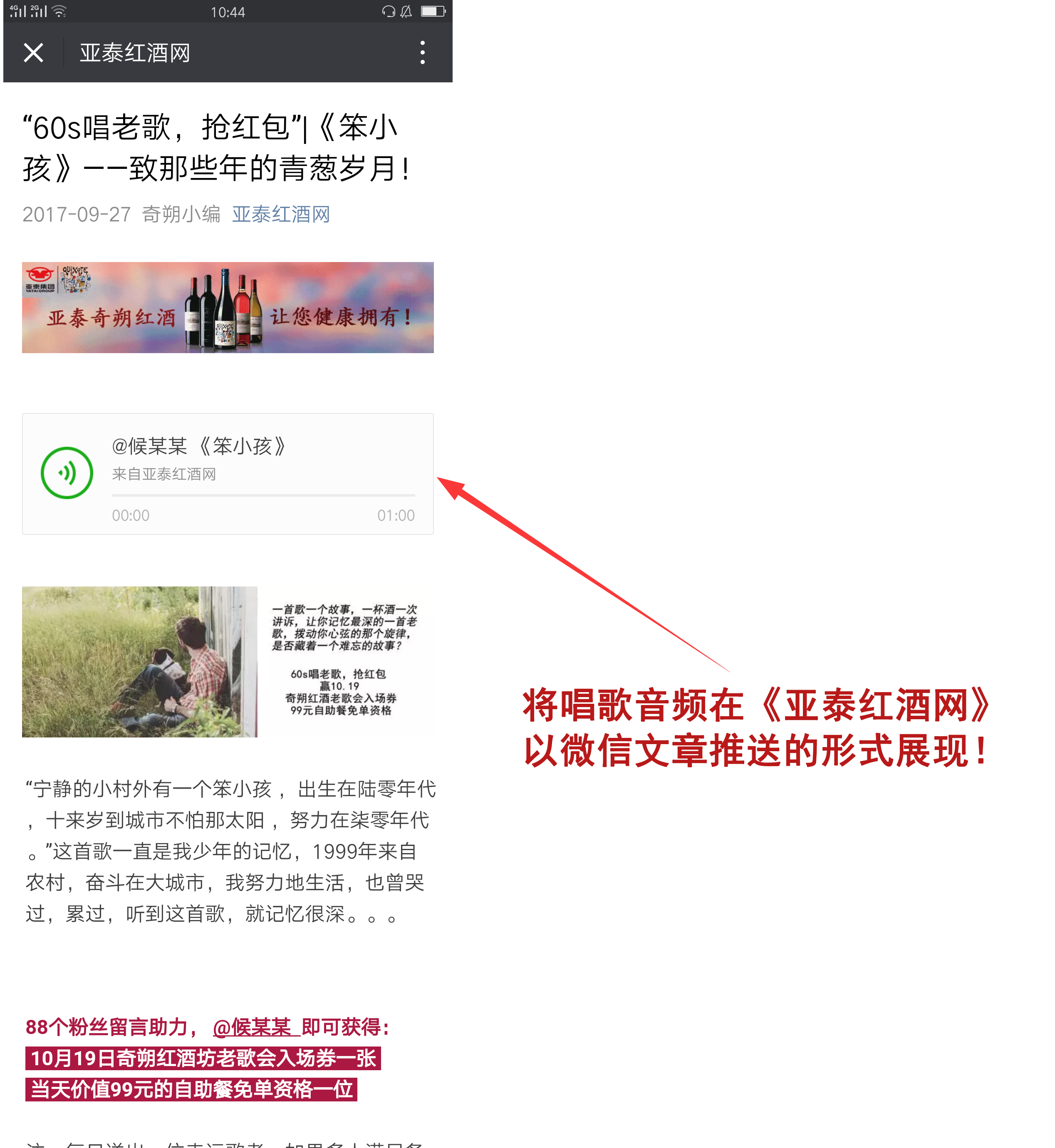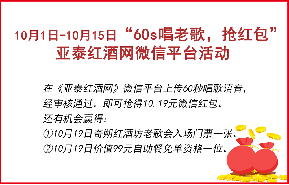 每一位抢得红包的歌者,其唱歌音频将在《亚泰红酒网》微信公众平台推文中展现,届时只要有88名粉丝在文章底部留言助力,即可成为幸运歌者,赢得10月19日奇朔红酒坊老歌会免费入场门票一张,以及价值99元自助餐免单资格一位。