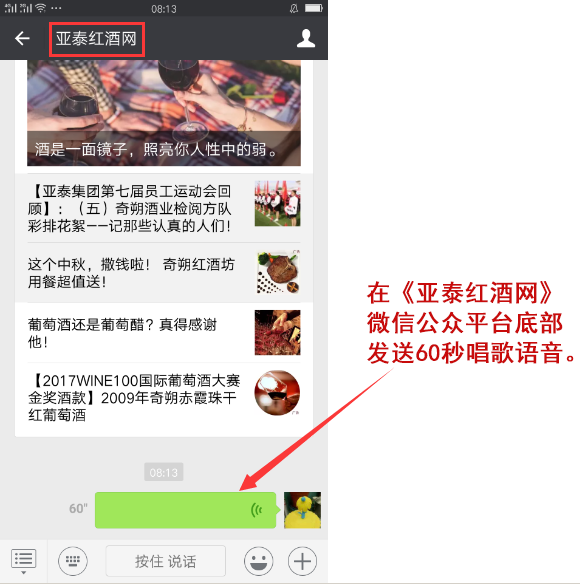 在《亚泰红酒网》微信公众平台底部上传60秒唱歌语音,只要你的歌声够深情,经奇朔小编审核通过,即得10.19元微信红包。