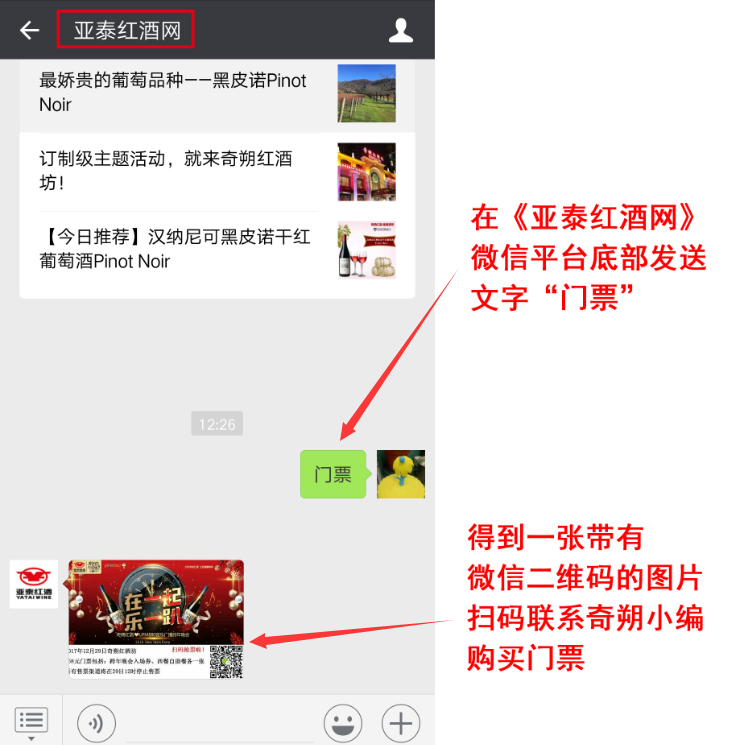 1.在《亚泰红酒网》微信平台发送文字“门票”,得到奇朔小编微信二维码,联系奇朔小编,留下姓名及联系方式,进行购票。