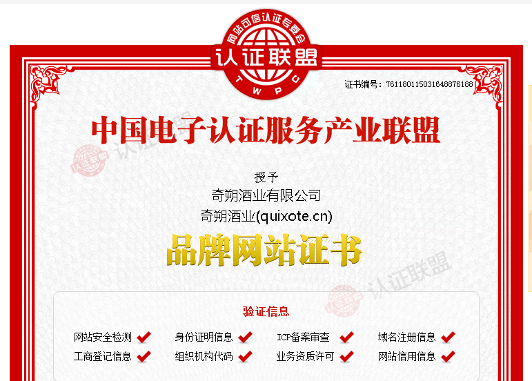 在互联网渠道上,奇朔酒业专注于建立开发自有信息平台——奇朔酒业官网,着紧布局于《亚泰红酒网》微信公众号及今日头条号等自媒体平台,积极开发亚泰E家、京东等第三方电商渠道。此次,奇朔酒业官网通过了该联盟的对“公司资质“、“官网服务系统运营状况”、“网上信息真实情况”等信息的层层审核与严格调查,得以荣获中国电子认证服务产业联盟颁发的“2017年度行业优秀企业奖”,是对奇朔酒业互联网渠道建设超前发展的最好见证!