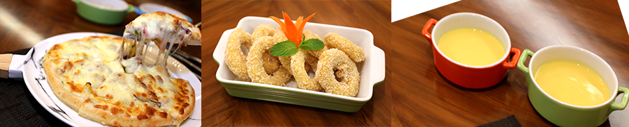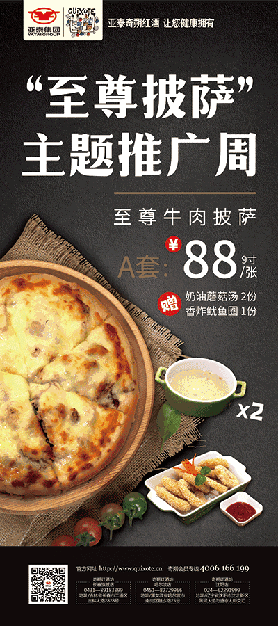 至尊牛肉披萨9寸 ¥88元/张,赠送奶油蘑菇汤2份,香炸鱿鱼圈1份;