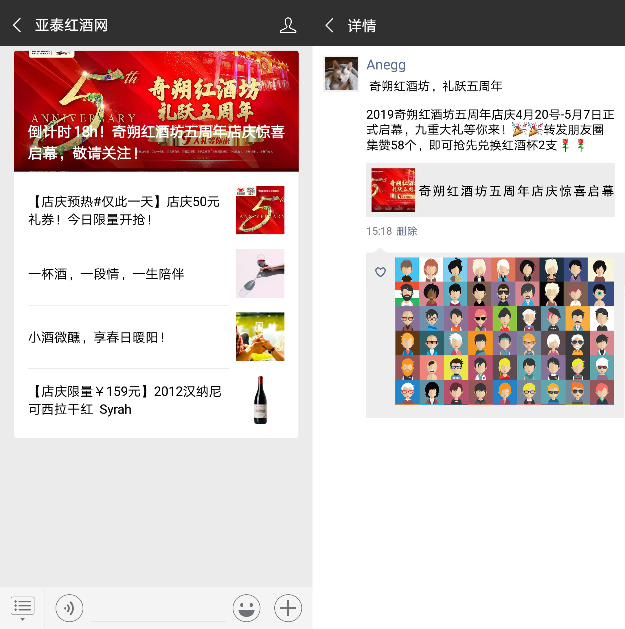 店庆期间,凡转发指定“奇朔红酒坊店庆活动宣传”至微信朋友圈,集赞满58个即可获得红酒杯2支,请将集赞截图发至《亚泰红酒网》微信平台,并留下有效联系方式,具体领奖时间及方式将在微信平台公布。