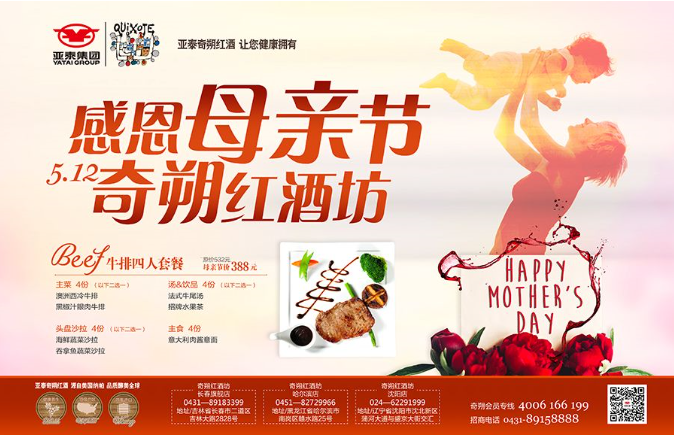 没有女人不喜欢浪漫,你亲爱的妈妈也不例外!5.12母亲节那一天不如选一个有格调的西餐厅,开一瓶精致优雅的红葡萄酒,用牛排配红酒的浪漫,带给妈妈节日惊喜!