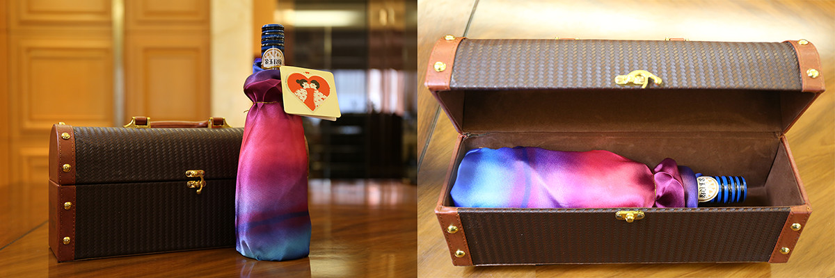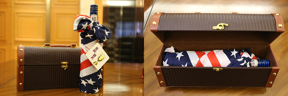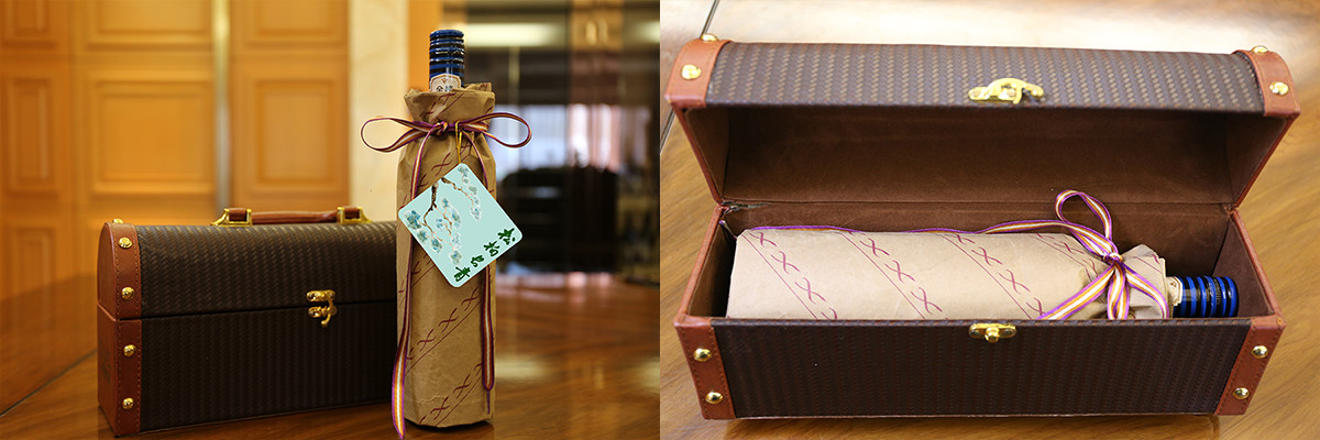 铜牌烫金奢华单支皮盒,酒脖铜板悬挂,酒瓶保鲜膜封口,纪念贺卡