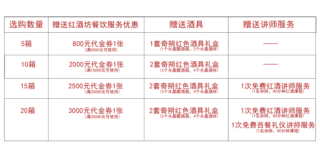 凡选购礼品酒定制服务,即可享受长春奇朔红酒坊餐品消费8折优惠并减免全部场地使用费(仅限本次礼品酒使用活动),享受“活动LOGO设计”、“活动策划”、“侍酒服务”、“红酒坊餐饮服务代金券”、“酒具礼盒赠送”、“ 红酒讲师服务”以及“媒体邀请”、“明星祝福视频录制”等多种附加优惠,具体细则详见下面表格。