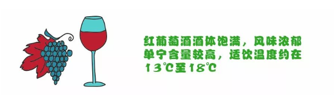 一般来说,红葡萄酒中酒体相对饱满的酒款,其适饮温度相对更高,比如酒体厚重的加州赤霞珠与酒体轻盈的法国博若莱佳美,往往是前者的适饮温度略高一些。