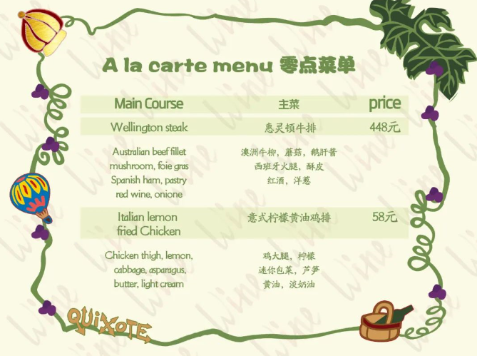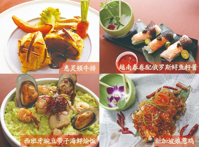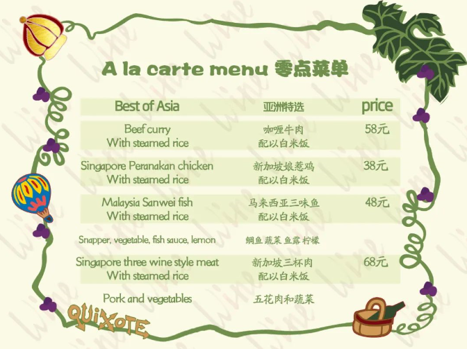 推陈出新,美味呈现惠灵顿牛排、西班牙酥皮饺子、什锦杂扒、西班牙海鲜烩饭等菜品,特别新增马拉西亚三味鱼、新加坡娘惹鸡等东南亚餐品,经过内外部试菜,收获好评美誉。零点餐品,不设最低消费。同时,面向集团内部加推中菜私人订制。更多零点菜品,请致电咨询。奇朔红酒坊恭迎您的到来,愿美食与红酒陪伴您快乐生活!