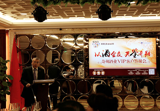 奇朔酒业总经理李显堂在致辞中对各位VIP会员一年来的支持和理解致以衷心的感谢,对服务中存在的不足表示了歉意,并郑重承诺将在新的一年里继续秉承专心、专业、专注的精神,以传播新世界红酒为己任,继续为尊贵的客户带来加州纳帕谷的经典美酒!超值体验!