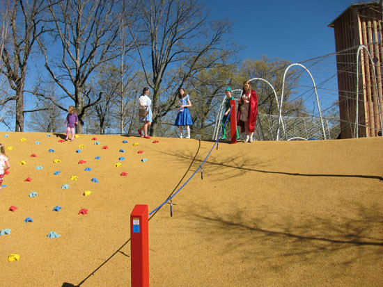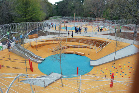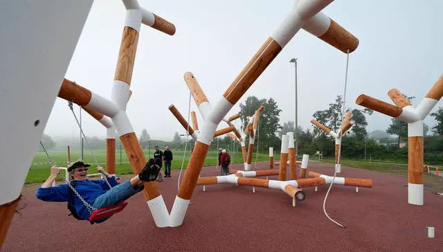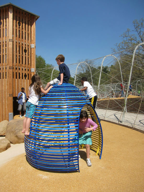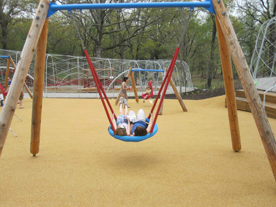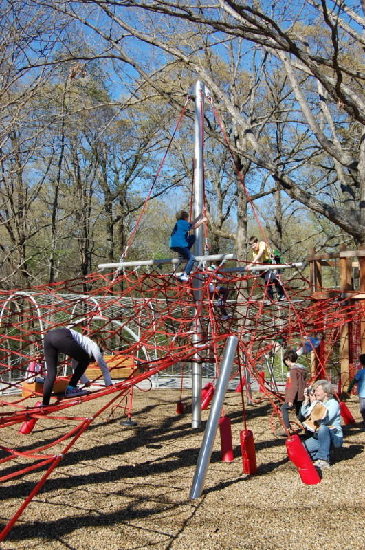 谢尔比农场公园的林地探索游乐园是有JamesCorner Field Operations公司设计的,目的是恢复林地,同时改善儿童健康。4.25英亩游乐园的设计是基于儿童的游戏理论,同时也广泛征求家长和孩子们的想法。在游乐区使用可回收鞋材,在网和树屋的游戏房下使用的是靴材。渗透性的材料可以使雨水滋养游乐房周围的乔木等本地树种。