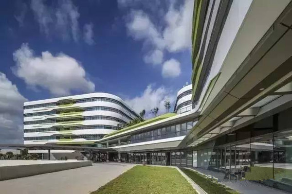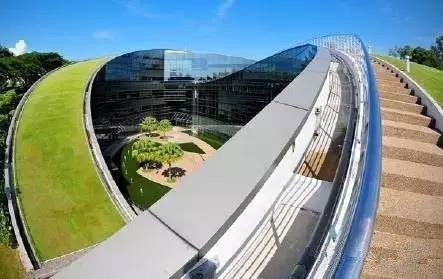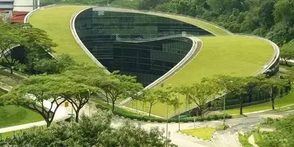 这个生态建筑是新加坡南洋理工大学校区里的的艺术设计媒体学院大楼。这片屋顶可以帮建筑物抵挡强烈的日照,有效的降低大楼内的温度。而且设计师也特别将草坪从屋頂延伸到地面,是希望教室里的师生们可以走出教室,到戶外体验大自然。建筑位于校园核心,周围都是树造型上也像是一个绿肺,内部立面采用高性能隔热玻璃幕。