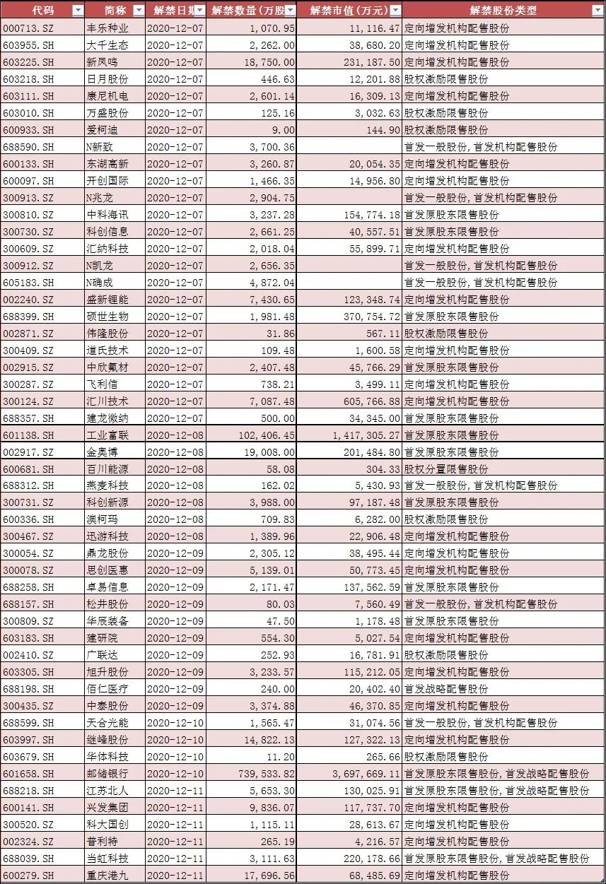 从解禁市值来看,12月10日是解禁高峰期,4家公司解禁市值合计385.64亿元,占本周解禁规模45.91%。按12月4日收盘价计算,解禁市值居前三位的是:邮储银行(369.77亿元)、工业富联(141.73亿元)、汇川技术(60.58亿元)。从个股的解禁量看,解禁股数居前三位的是:邮储银行(73.95亿股)、工业富联(10.24亿股)、金奥博(1.9亿股)。