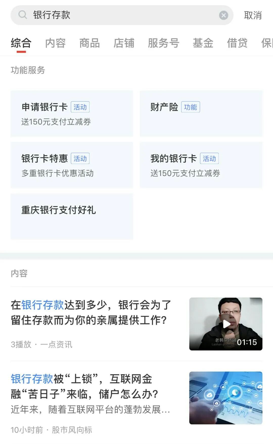 据了解,支付宝、腾讯理财通、京东金融等平台一度销售火爆的互联网存款产品已纷纷下架。目前搜索“银行存款”的结果显示,无具体产品。