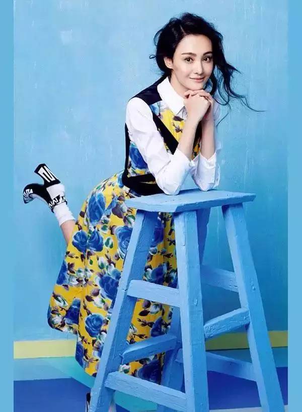 郑爽身穿蓝黄色的连衣裙,裙子在拼接黑色的设计下,让图案富丽堂皇的花卉带着优雅淑女的气质。她穿着黑白拼色的高跟鞋带着点诙谐,整体更多的却是时尚个性。
