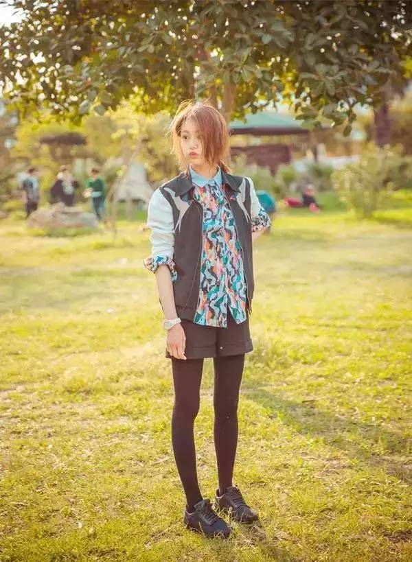 爽妹子身穿一件迷彩衬衫+外套+黑色短裤+黑色裤袜搭配运动鞋。这件上衣不同于绿色的迷彩,蓝橘色的迷彩更加时尚有个性,同时与绣花棒球帽的外套搭配,让人觉得爽妹子清新又休闲。