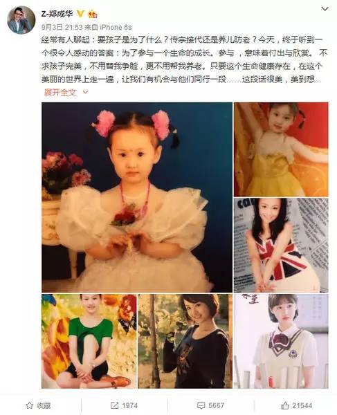 以下是郑爽爸爸微博原文:经常有人聊起:要孩子是为了什么?传宗接代还是养儿防老?今天,终于听到一个很令人感动的答案:为了参与一个生命的成长。参与,意味着付出与欣赏。不求孩子完美,不用替我争脸,更不用帮我养老。只要这个生命健康存在,在这个美丽的世界上走一遍,让我们有机会与他们同行一段……这段话很美,美到想哭……于是告诫自己:换个方式去爱孩子!只要他们健康、快乐,足矣!从此以后希望我大壳永远是快乐的成长。