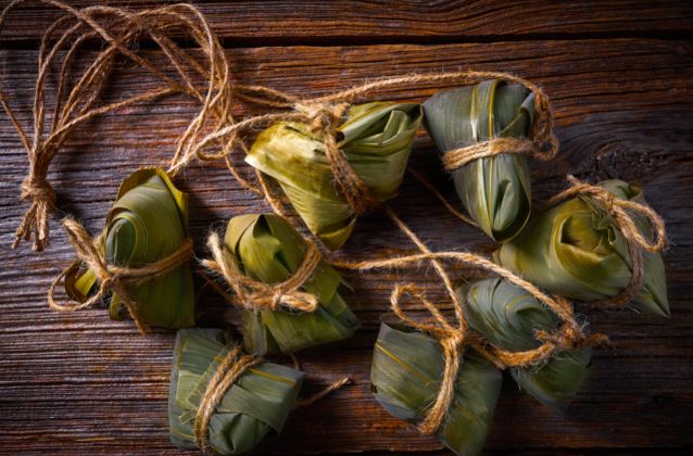 用来包裹塑形的粽叶有干制也有鲜材,新鲜叶片的碧绿色泽虽然引人入胜,但上锅蒸熟后也不复青翠年华了。关键倒不在颜色,能借得些草木清香便算好处。至于品种取材,更多则是与地域有关。北方以芦苇叶为主,华东、华南、长江流域,则更多见的是箬竹叶。再往南去,两广及福建、海南一带又有用冬叶——即柊叶,以及芭蕉叶、荷叶,无一例外的都是平展、宽阔、质地厚实的大叶片。