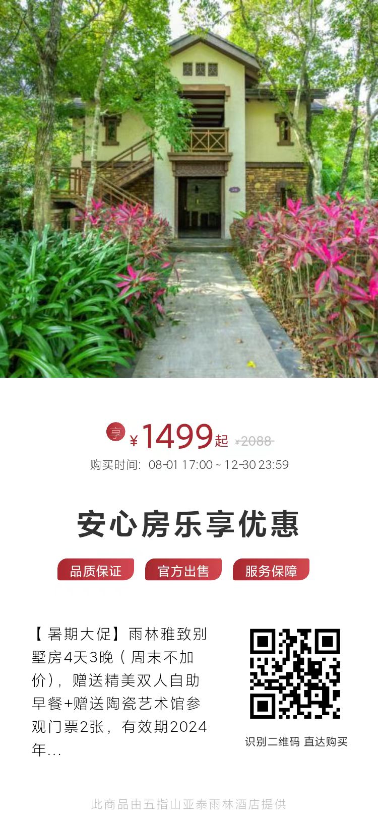 雨林雅致别墅房4天3晚(周末不加价),赠送精美双人自助早餐+赠送陶瓷艺术馆参观门票2张,有效期2024年12月30日。