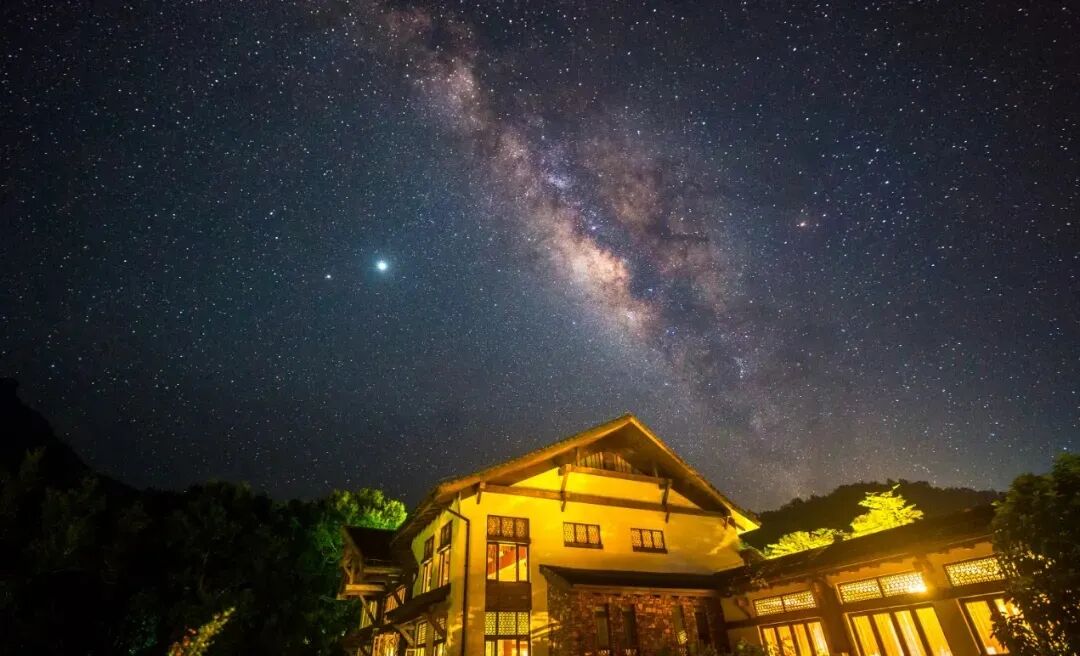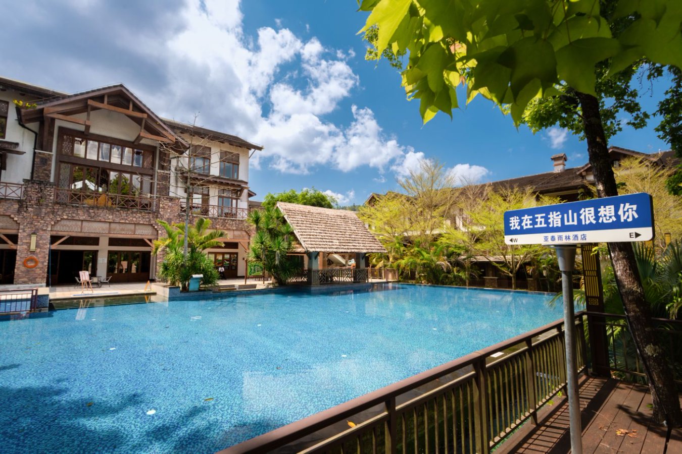 酒店的雨林景观房自带观景阳台,晚上躺在藤椅上,抬头就是璀璨星空。更有地道的海南风味晚餐,食叶草酸汤鱼、小黄牛、五指山野菜、山兰米酒,每一口都是山野的味道。