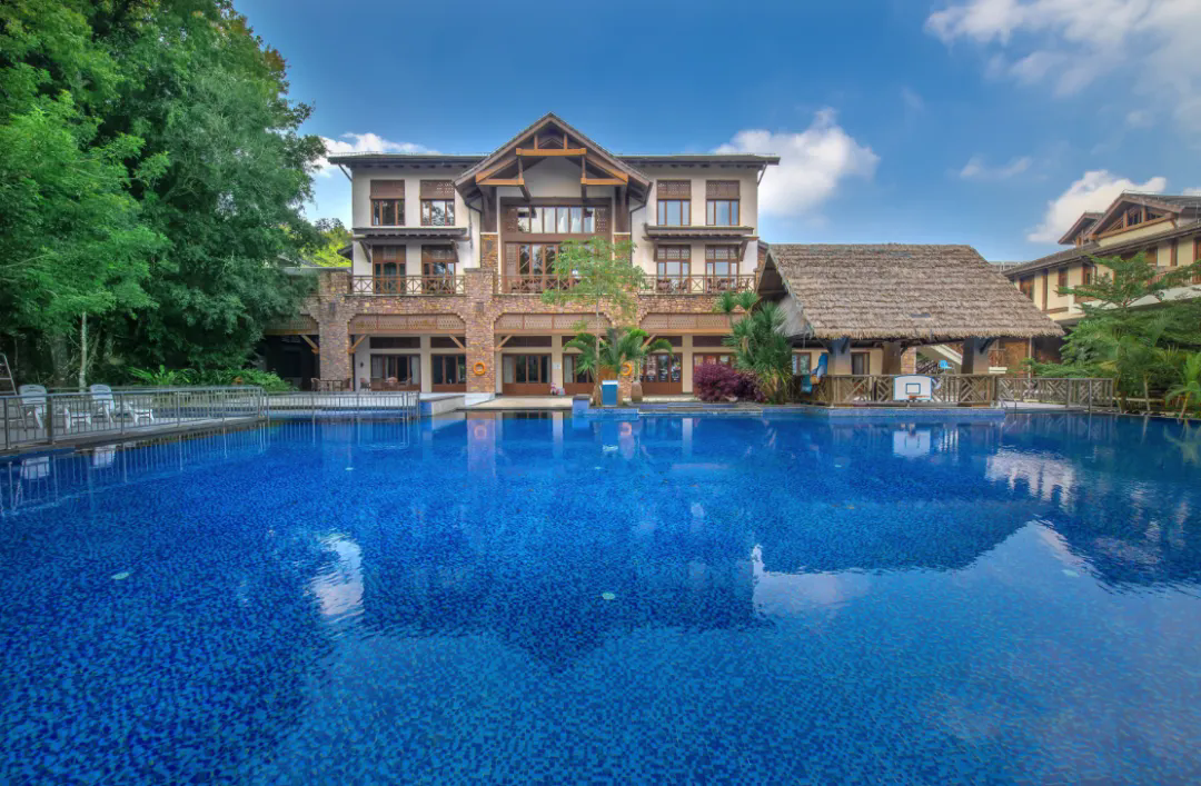 酒店占地143亩,建筑巧妙地融合了东南亚风情与传统的黎族船型屋、吊脚楼元素,大力神、蛙纹等黎苗图腾点缀其间,让建筑 本身就成为了一道文化风景线 。