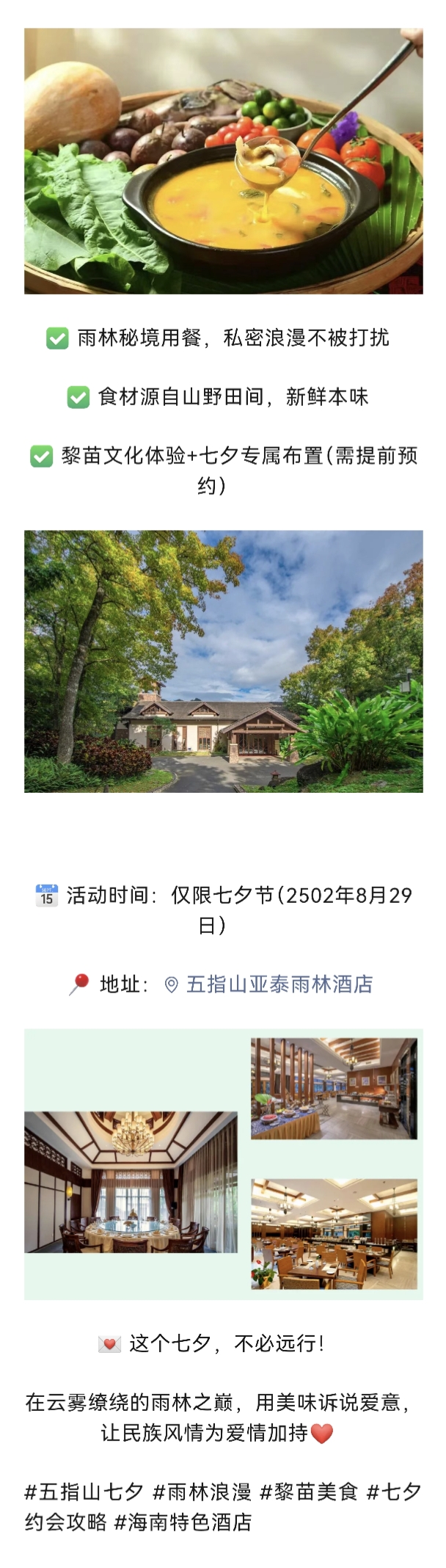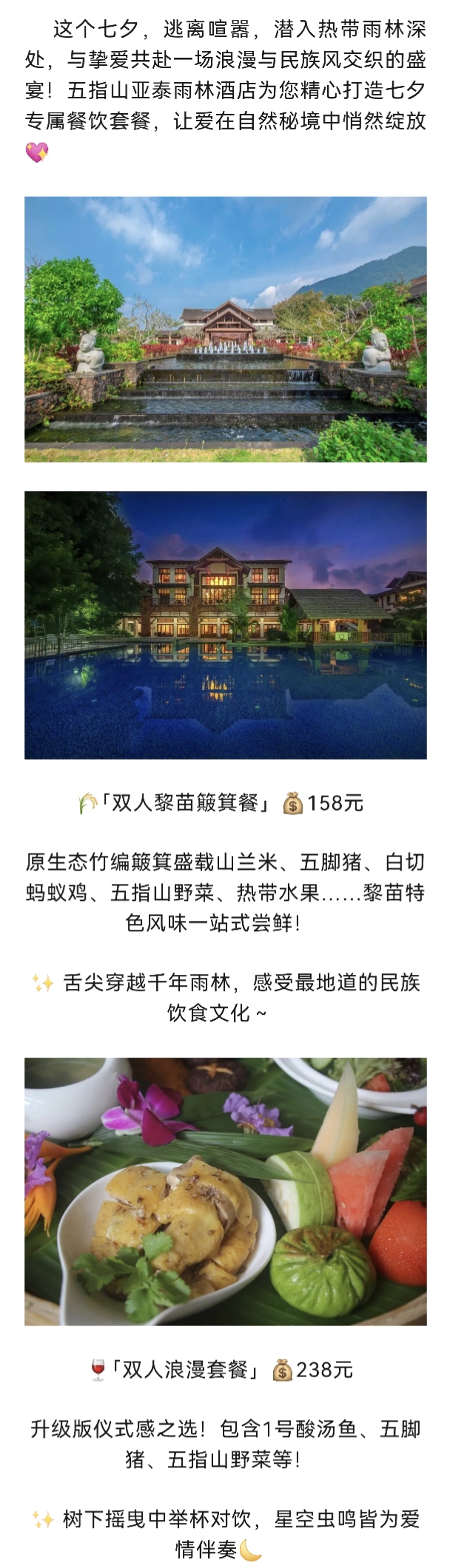 七夕限定 | 五指山亚泰雨林酒店·黎苗风情双人餐。