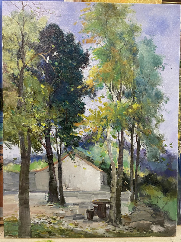 在古朴的院子里,几棵苍劲的古树静静矗立,秋风拂过,