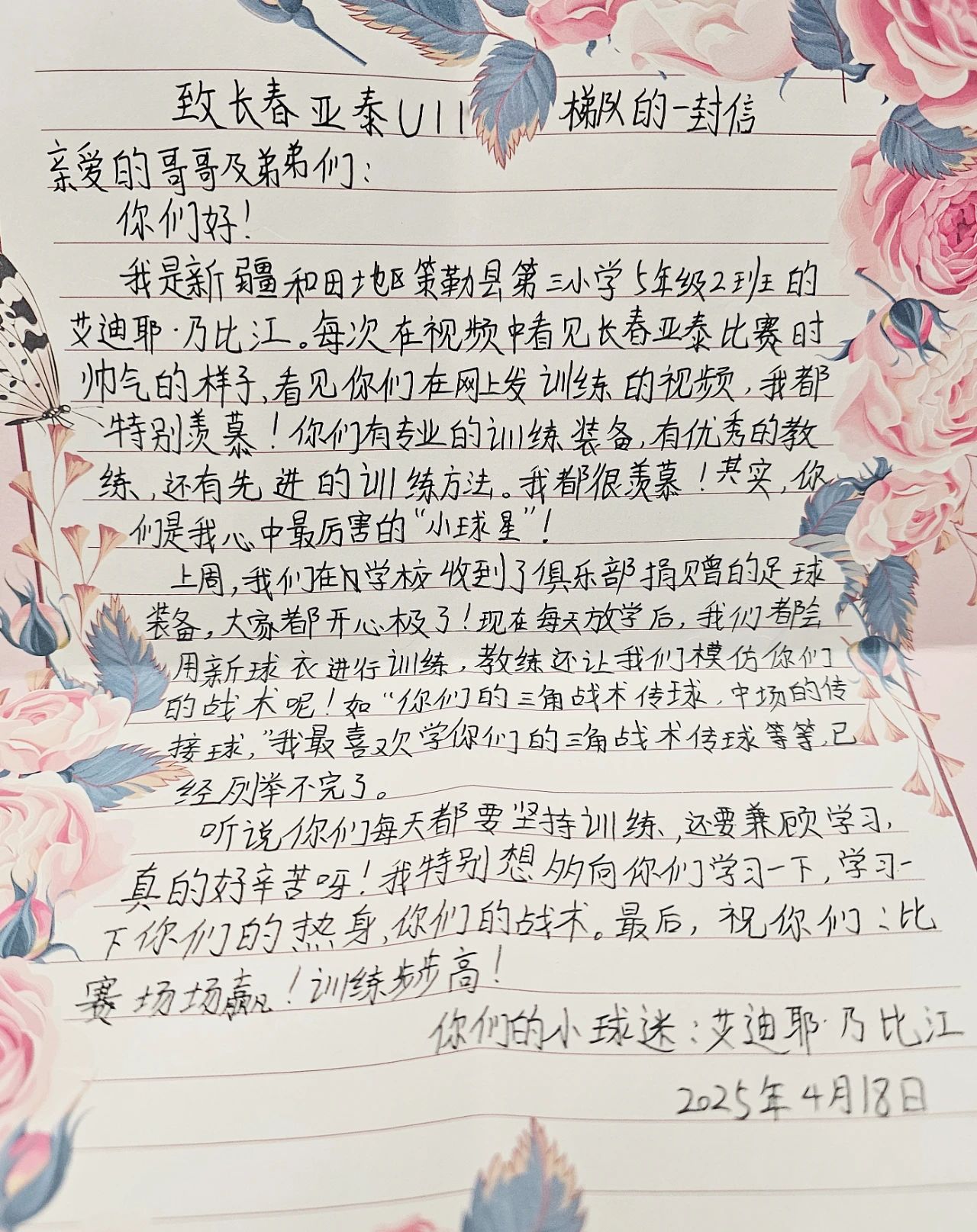 足球,不仅仅是一项运动,更是一座连接爱与希望的桥梁。长春亚泰U11队与新疆策勒县两所学校的暖心互动,诠释了“足球不仅是竞技,更是教育”的理念。通过长春亚泰U11队小球员的捐赠装备、书信往来等互动形式,将足球转化为孩子们可感知的温暖,彰显了长春亚泰“以足球传递温暖”的公益理念,在两地热爱足球的少年心中播撒下希望的种子。