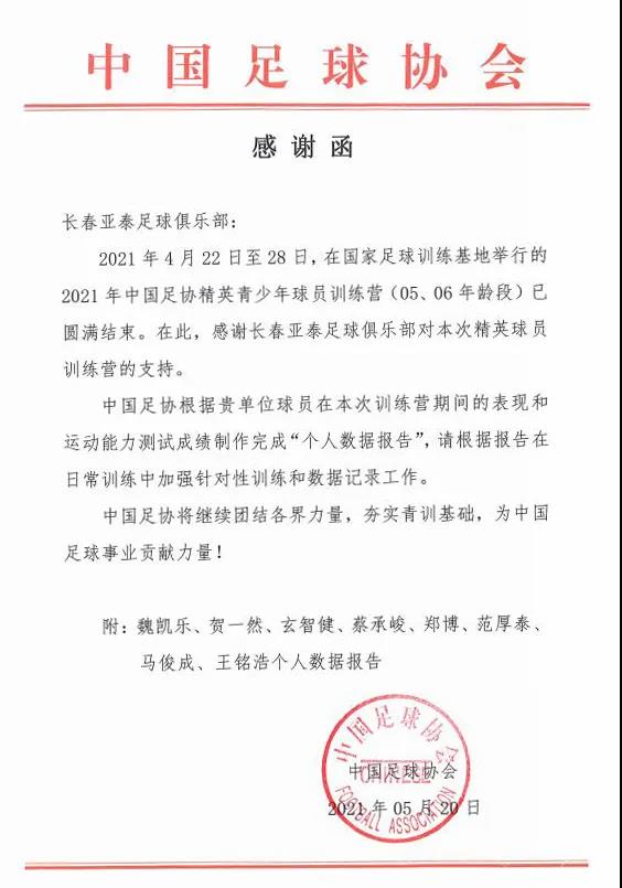 5月20日,中国足球协会向长春亚泰足球俱乐部发函,以感谢俱乐部对2021年中国足协精英青少年球员训练营的支持。