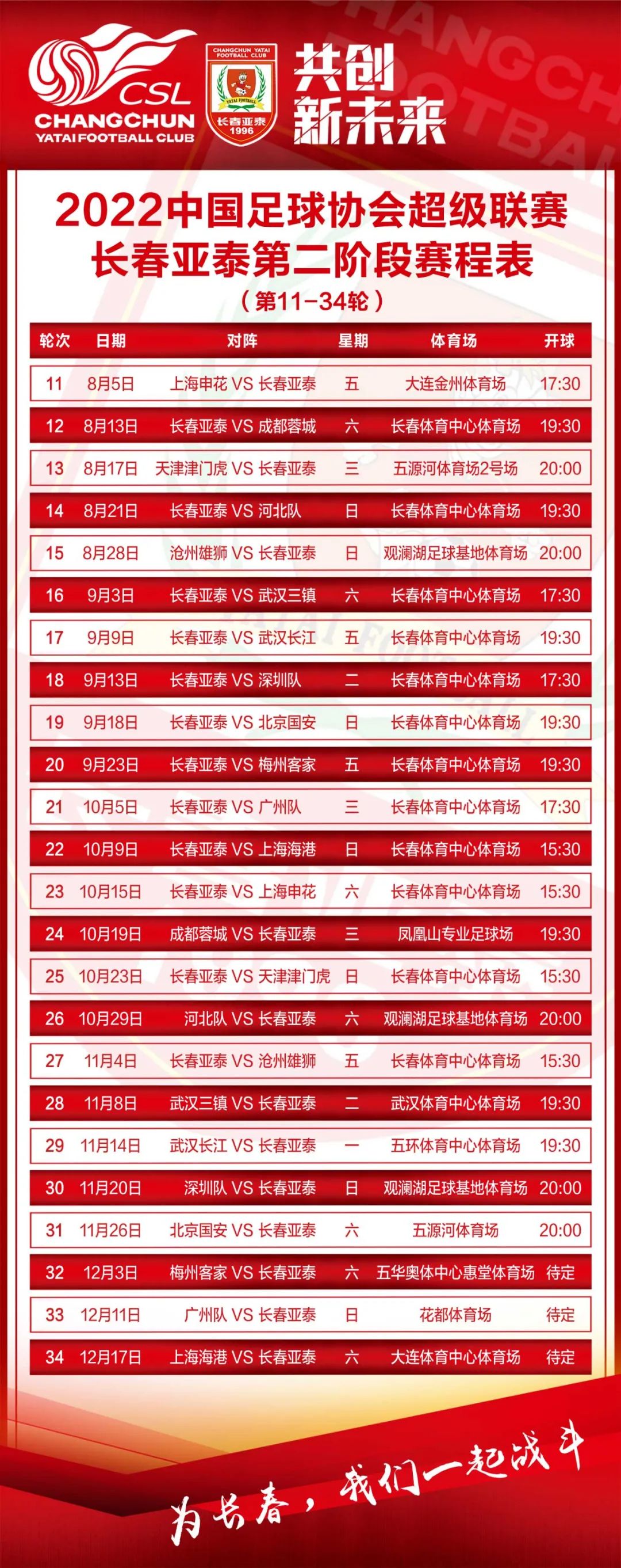 7月30日,恢复主客场制的2022赛季中超联赛第二阶段赛程出炉。8月5日17时30分,长春亚泰将做客大连金州体育场,与主场设在那里的上海申花上演第二阶段中超联赛“揭幕战”。8月13日19时30分,长春亚泰将坐镇“南岭”,迎来近三年来第一个联赛主场比赛,对手是升班马成都蓉城。