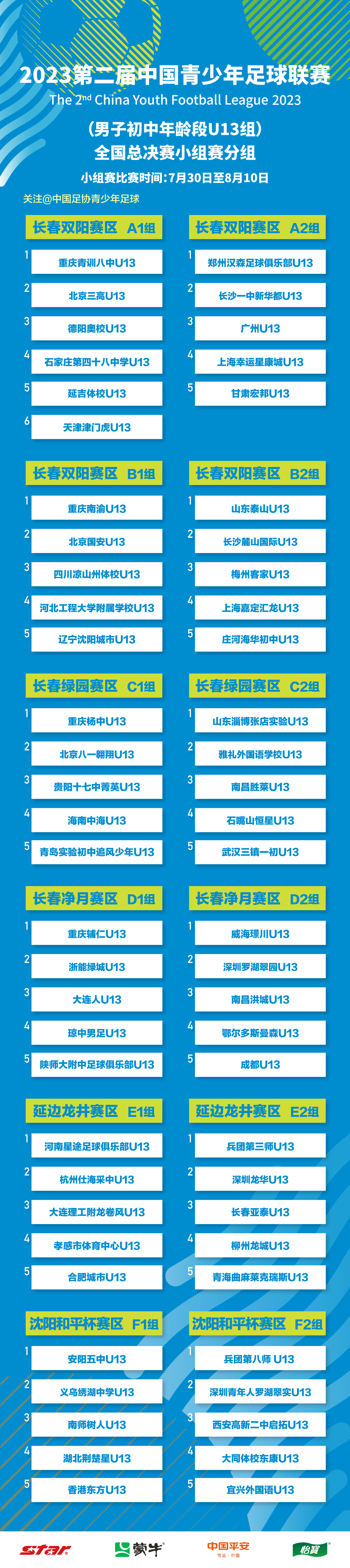 日前,2023年第二届中国青少年足球联赛(男子初中年龄段U13、U15组)全国总决赛小组赛分组出炉。男子U13组小组赛阶段将于7月30至8月10日在长春、延边、沈阳三地进行,亚泰净月基地将承办U13组长春净月赛区赛事。值得一提的是,这是此项全国青少年足球赛事第二次落户亚泰净月基地。目前,有关赛事各项准备工作已经就绪,28日起,深圳、重庆、成都、大连的球队将陆续抵达基地。