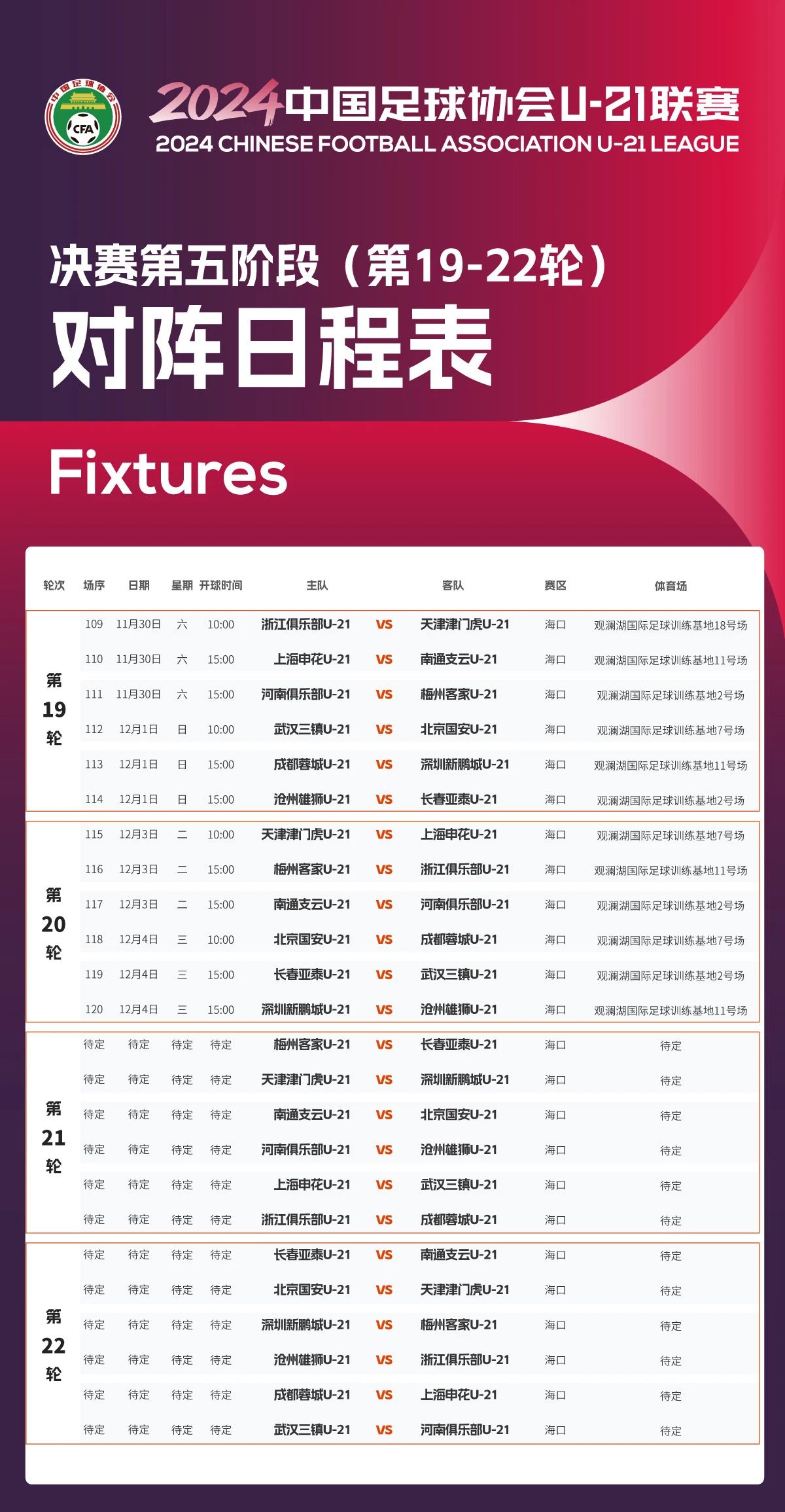 11月27日,代表吉林U18队征战首届全国三大球运动会的亚泰小伙子在长沙夺得季军。12月1日,亚泰U21队将在海口进行2024中国足协U21联赛决赛阶段第五阶段较量。本阶段,长春亚泰U21队将与沧州雄狮U21队、武汉三镇U21队、梅州客家U21队、南通支云U21队进行4轮赛事,确定最终排名。