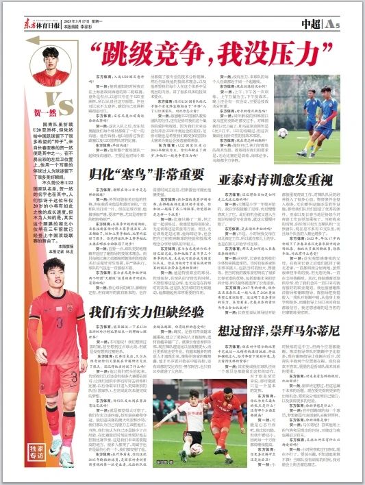 贺一然:接到通知的时候我正在上海备战同海港的第二轮联赛。意外是有点,以前只专注于U20亚洲杯,所以从没往这方面想。但也可以说不太意外,感觉自己亚洲杯踢得还可以。