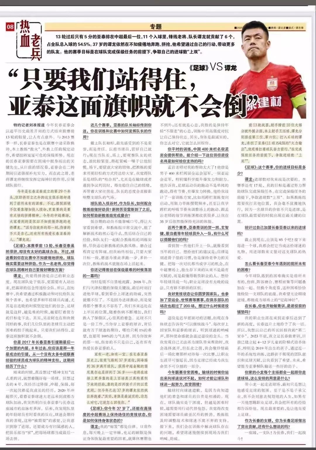 谭龙:我觉得拼劲是自己的职业态度。现在球队处于低谷,更需要有人站出来,把赢球的信念传递给全队。所以,在比赛中,我希望通过积极跑动和对抗给队友做个表率,也希望多和年轻球员沟通,尤其是在连败的时候坚定他们的信念。足球就是这样,越是难的时候,越要盯着前方的目标走下去。其实,吴亚轲也在和我做同样的事,我们几位队里的老球员主动把困难的担子挑起来,只要我们站得住,亚泰这面旗帜就不会倒。