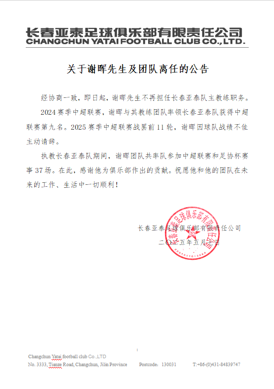 【亚泰公告】关于谢晖先生及团队离任的公告
