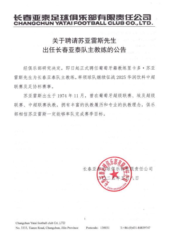 【亚泰公告】关于聘请苏亚雷斯先生出任长春亚泰队主教练的公告