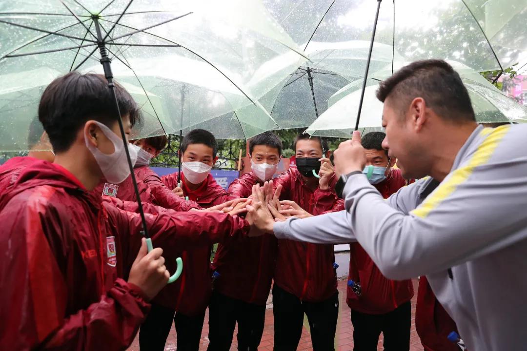 进考场前,亚泰 U15 队主教练尤龙为球员考生加油鼓劲