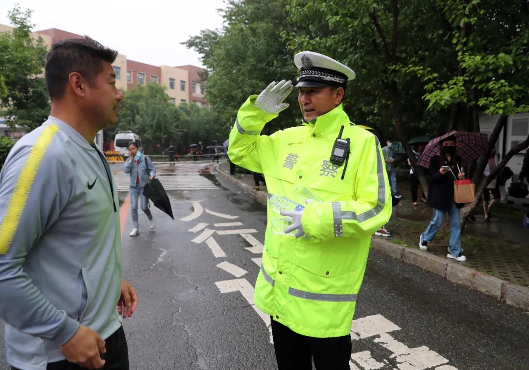 亚泰 U15 队主教练尤龙代表俱乐部为考生家长和执勤民警送水