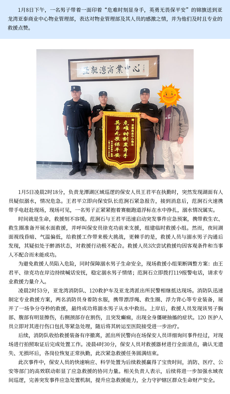 深夜紧急救援!亚龙湾亚泰商业中心暖心救援显担当,获救男子赠锦旗表谢意