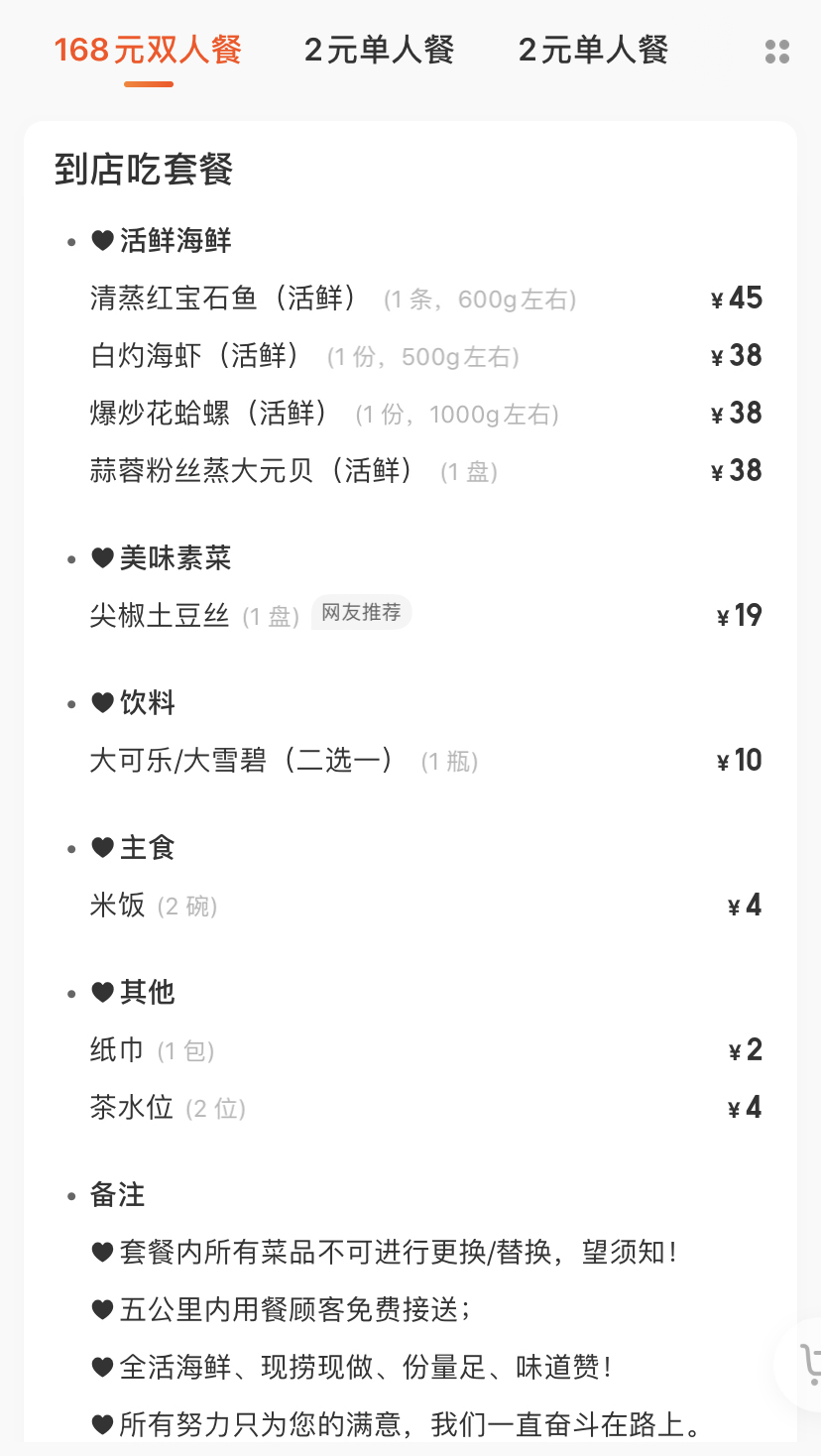 跳跳鱼海鲜餐厅实惠双人套餐仅售168元