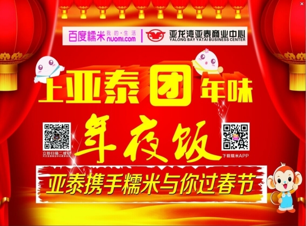 明天起至春节长假期间,百度糯米将为亚泰商业中心用户进行下单立减补贴,2016的年夜饭,如果您在亚龙湾,不妨来亚泰商业中心,圆您一个团圆梦!
