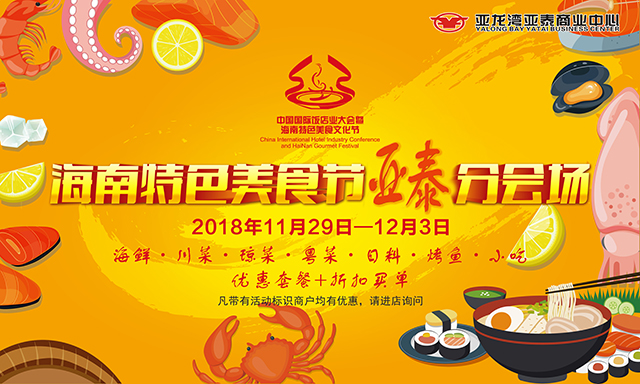 大会期间还将于11月29日-12月2日举办海南特色美食文化节,亚龙湾亚泰商业中心作为本次美食文化节的分会场,将举办“海南美食街区美食促销周”活动。