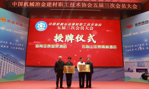 大会授予“海南亚泰温泉酒店”“五指山亚泰雨林酒店”为中国机械冶金建材职工技术协会“劳模工匠疗养基地”,中国机械冶金建材职工技术协会执行会长毛迎春、秘书长王林林为企业授牌。