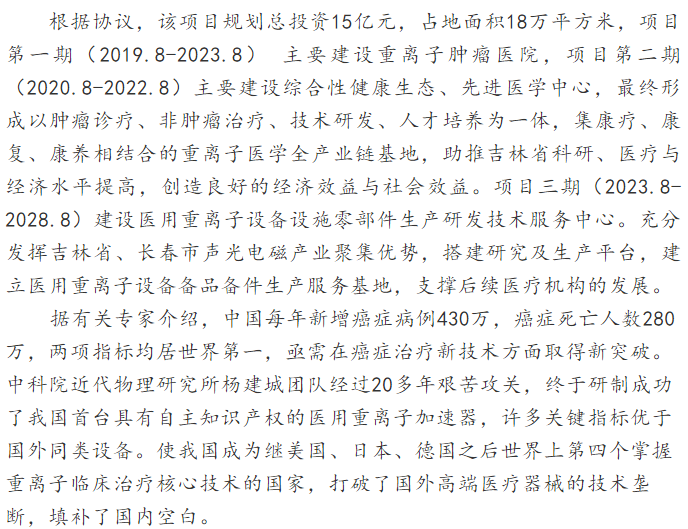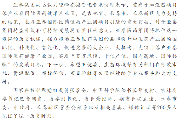 东北三省首台医用重离子加速器项目 正式落户长春亚泰国际医药健康产业园