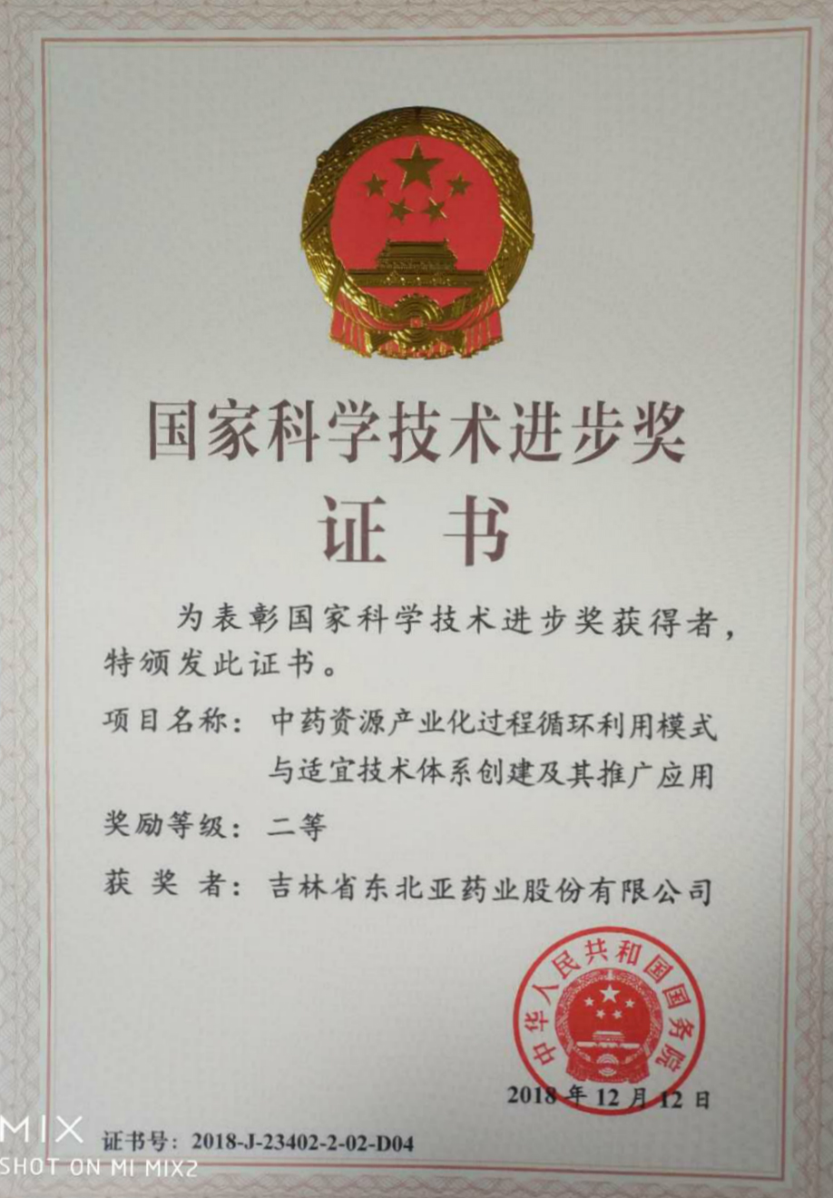 2019年1月8日,2018年度国家科学技术奖励大会在人民大会堂隆重召开,党和国家领导人出席大会并为2018年度国家科学技术奖获奖代表颁奖。亚泰医药集团子公司吉林省东北亚药业股份有限公司与南京中医药大学等单位共同完成申报的“中药资源产业化过程循环利用模式与适宜技术体系创建及其推广应用”项目荣获“2018年度国家科学技术进步奖二等奖”。