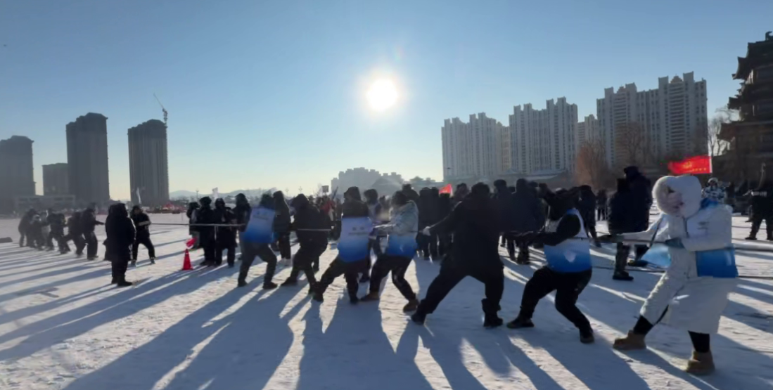 在雪地拔河赛场上,亚泰东北亚药业代表队的队员们牢牢握紧长绳,双脚用力蹬着冰雪,身体向后倾斜,构筑起一道坚实的防线。随着裁判的哨声响起,队员们齐声呐喊,齐心协力,将力量凝聚在一起。那条红绸带在中线两侧不断地来回拉扯,仿佛在进行一场激烈的较量。场外,亚泰东北亚啦啦队的加油声和呐喊声连绵不绝,如潮水般为参赛队员注入了强劲的动力。大家齐心协力,心往一处想,劲往一处使。凭借坚韧不拔的毅力和团结协作的精神,展现出亚泰东北亚人敢打敢拼、永不言弃的奋斗风貌。