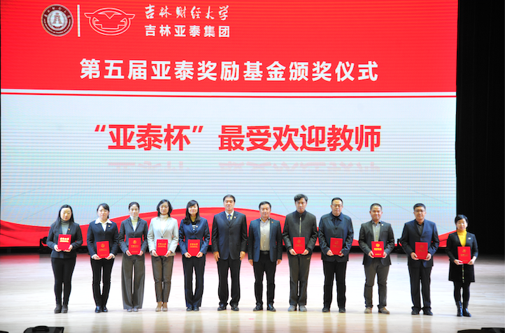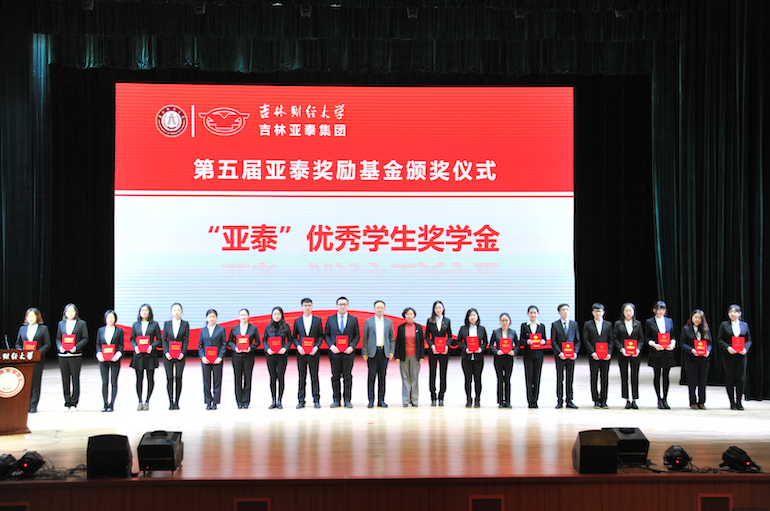 2018年12月19日下午,第五届亚泰奖励基金颁奖仪式在吉林财经大学多功能学术中心举行。亚泰集团党委书记、副董事长、执行总裁、亚泰工商管理学院理事会副理事长刘树森,亚泰集团党委副书记、工会主席、副总裁李斌,亚泰集团高管于来富;吉林财经大学党委书记周知民,党委副书记、校长孙杰光及相关校领导、职能部门负责人,全体辅导员和学生代表参加了颁奖仪式。