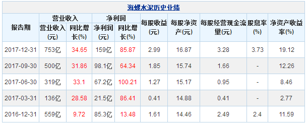 海螺水泥3月23日最新公布的2017年年报显示,其营业收入753亿元,同比增长34.65%;归属于上市公司股东的净利润159亿元,同比增长85.87%。基本每股收益2.99元。