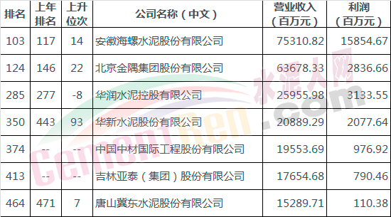 日前,财富中文网发布了最新的《财富》中国500强排行榜,考量了全球范围内最大的中国上市企业在过去一年的业绩和成就。水泥行业龙头企业海螺水泥、金隅集团、华润水泥、华新水泥、中材国际、吉林亚泰 、冀东水泥等多家企业荣登此榜。